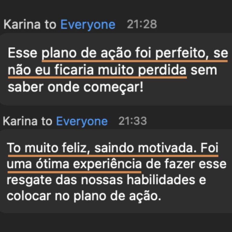 “Esse plano de ação foi perfeito, se não eu ficaria muito perdida, sem saber por onde começar. Estou muito feliz, saindo motivada. Foi uma ótima experiência.”