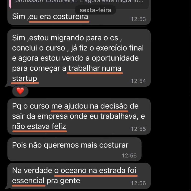 “Eu era costureira. Estou vendo para começar a trabalhar em uma startup. O curso me ajudou na decisão de sair, eu não estava feliz. O Oceano Na Estrada foi essencial!“