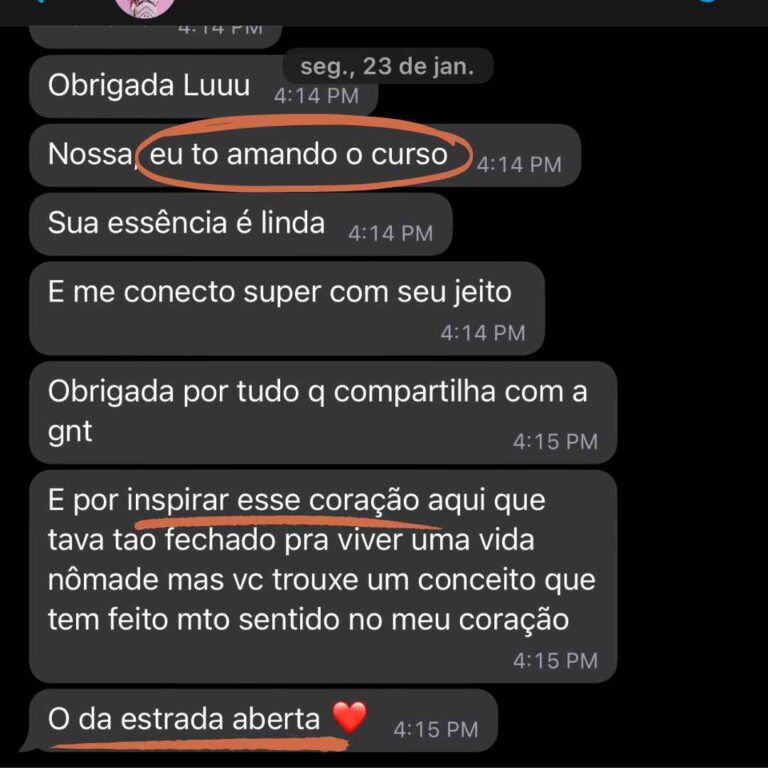 “Estou amando o curso! Obrigada por tudo que compartilha com a gente. E por inspirar esse coração que estava tão fechado”